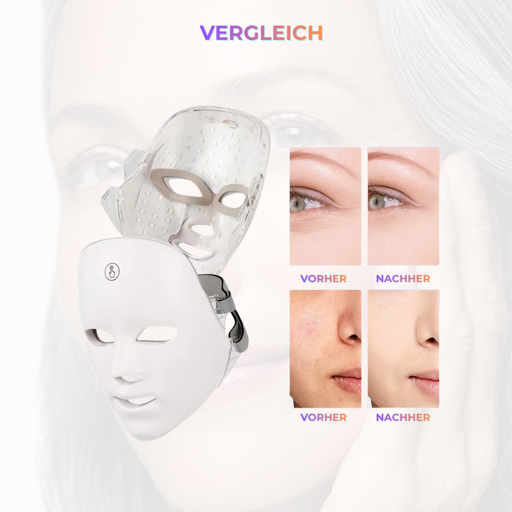 Die ergonomisch designte LED-Gesichtsmaske passt sich perfekt deinem Gesicht an und kombiniert 7 verschiedene Lichtfarben + Laserfunktion, um deine Haut gezielt zu regenerieren – sanft, schmerzfrei und effektiv.